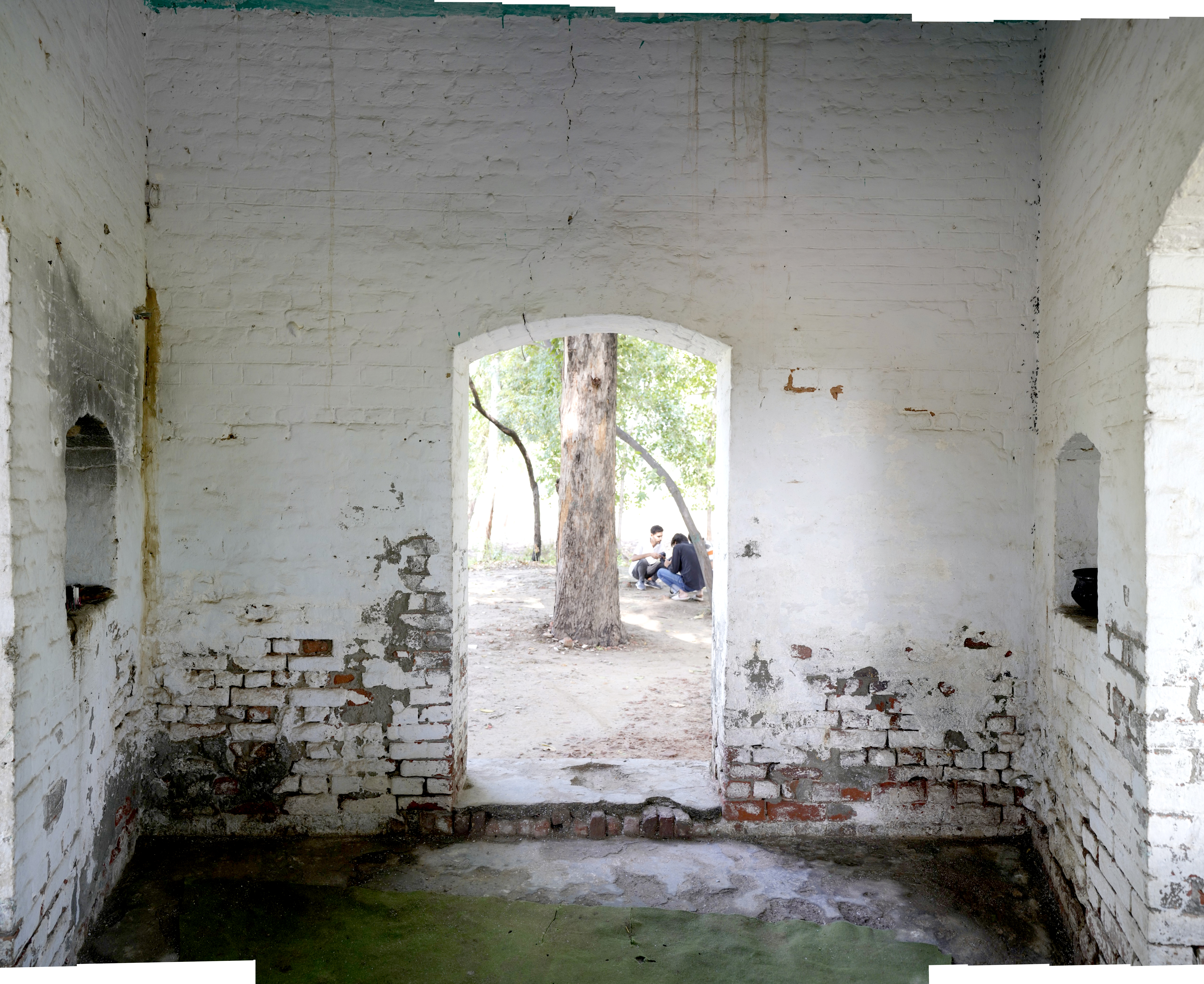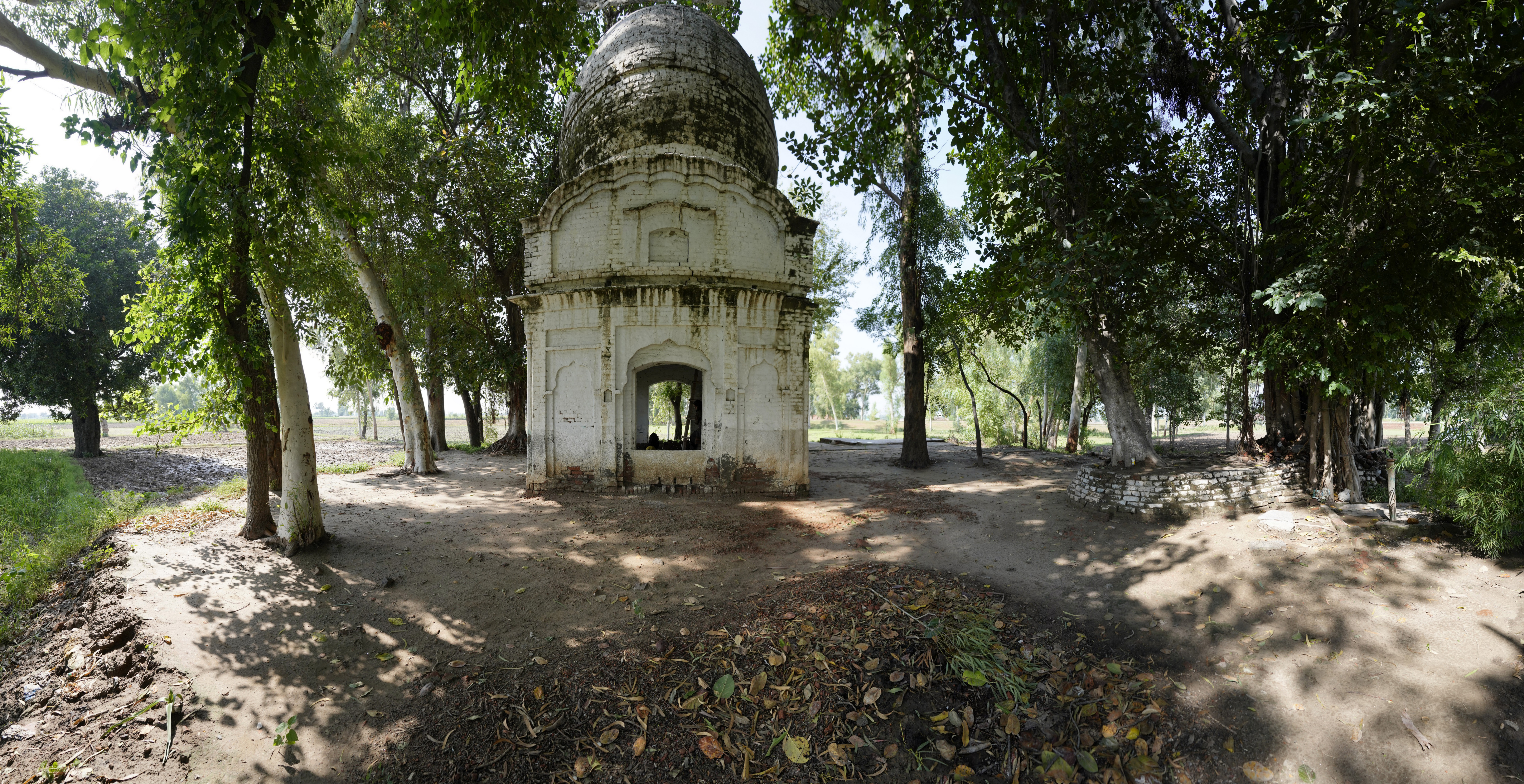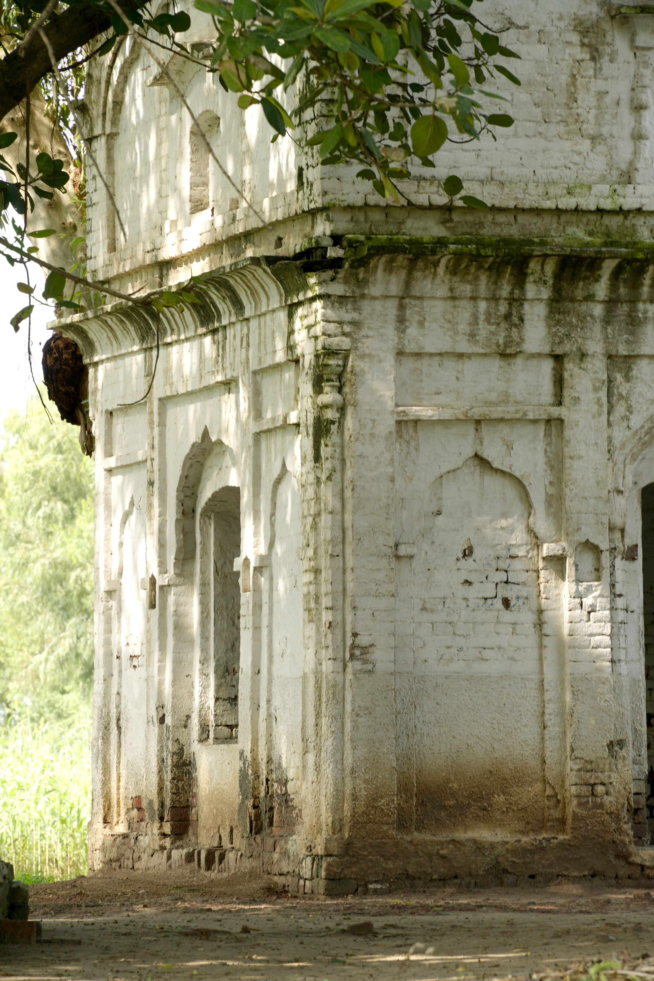 Unlike the elaborately finished and highly ornamental facades typical of other major gurdwaras, Gurdwara Sach Khand appears incomplete, which lends a distinct narrative to its architectural expression. The use of standard-sized bricks (9 x 4.5 x 3 inches) is evident throughout the structure, a detail that aligns with construction practices of the late colonial period. Furthermore, many grooves and shoulders of the arches indicate that the plasterwork, which would have added a layer of refinement and decoration, was never applied. These unfinished elements strongly suggest that the gurdwara was abandoned mid-construction, likely due to the Partition of India in 1947. It is possible that the gurdwara was intended to commemorate a story or event associated with Guru Nanak, but external circumstances halted its completion.