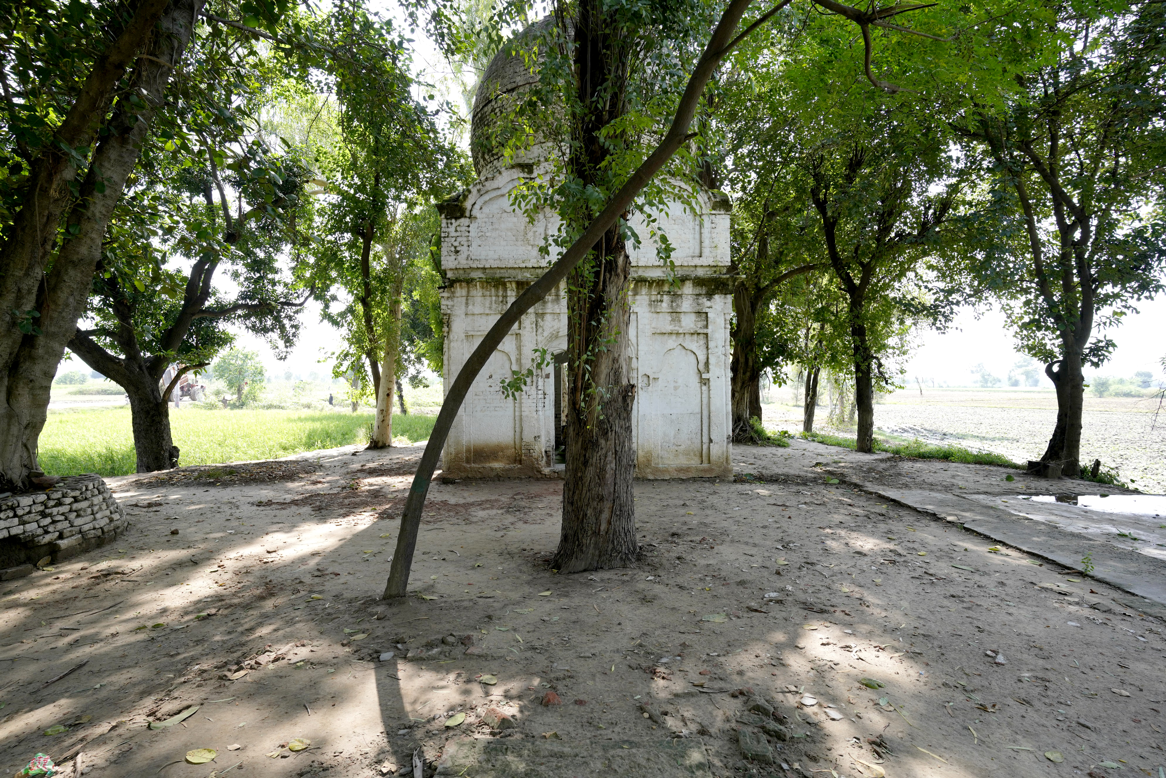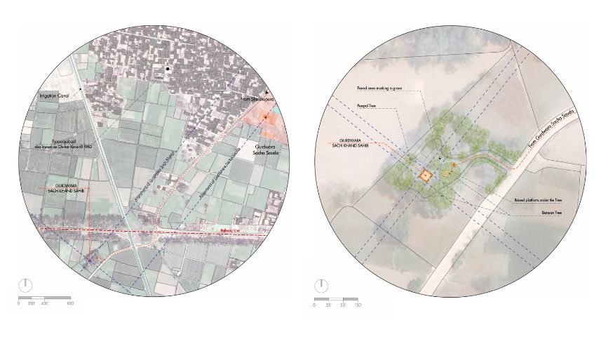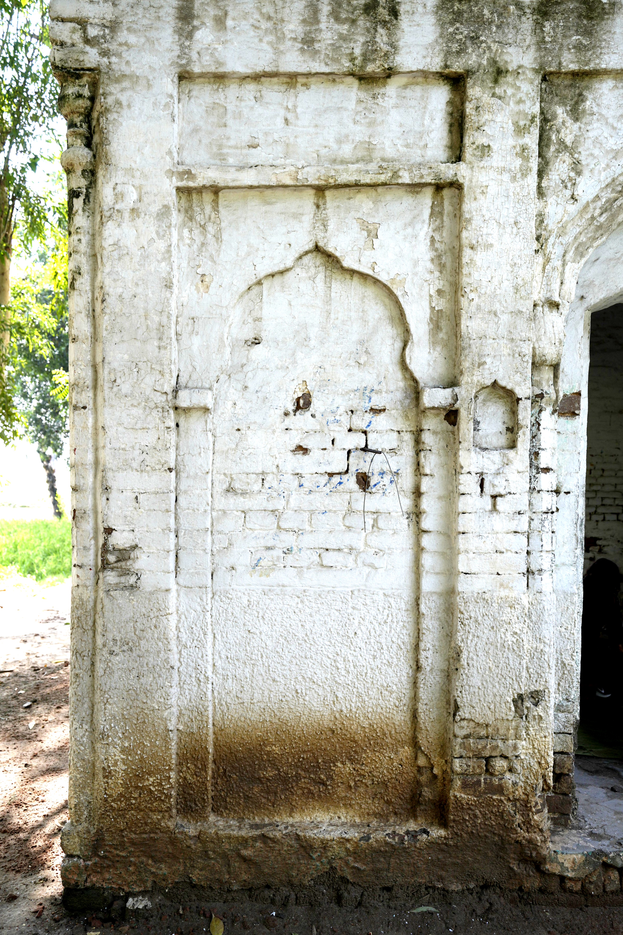 Unlike the elaborately finished and highly ornamental facades typical of other major gurdwaras, Gurdwara Sach Khand appears incomplete, which lends a distinct narrative to its architectural expression. The use of standard-sized bricks (9 x 4.5 x 3 inches) is evident throughout the structure, a detail that aligns with construction practices of the late colonial period. Furthermore, many grooves and shoulders of the arches indicate that the plasterwork, which would have added a layer of refinement and decoration, was never applied. These unfinished elements strongly suggest that the gurdwara was abandoned mid-construction, likely due to the Partition of India in 1947. It is possible that the gurdwara was intended to commemorate a story or event associated with Guru Nanak, but external circumstances halted its completion.
